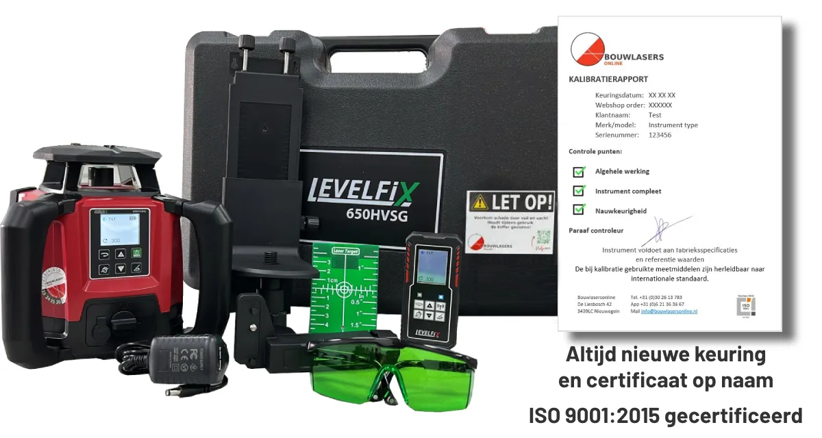Jouw meetwerk moet tot op de millimeter kloppen. Daarom wordt elke Levelfix 650HVG door onze eigen specialisten voor levering volledig gekalibreerd en gejusteerd in onze service-afdeling. Je ontvangt een officieel kalibratiecertificaat op jouw naam, perfect voor kwaliteitssystemen, keuringen en audits. Zo sta je sterk bij elke opdracht, groot of klein.