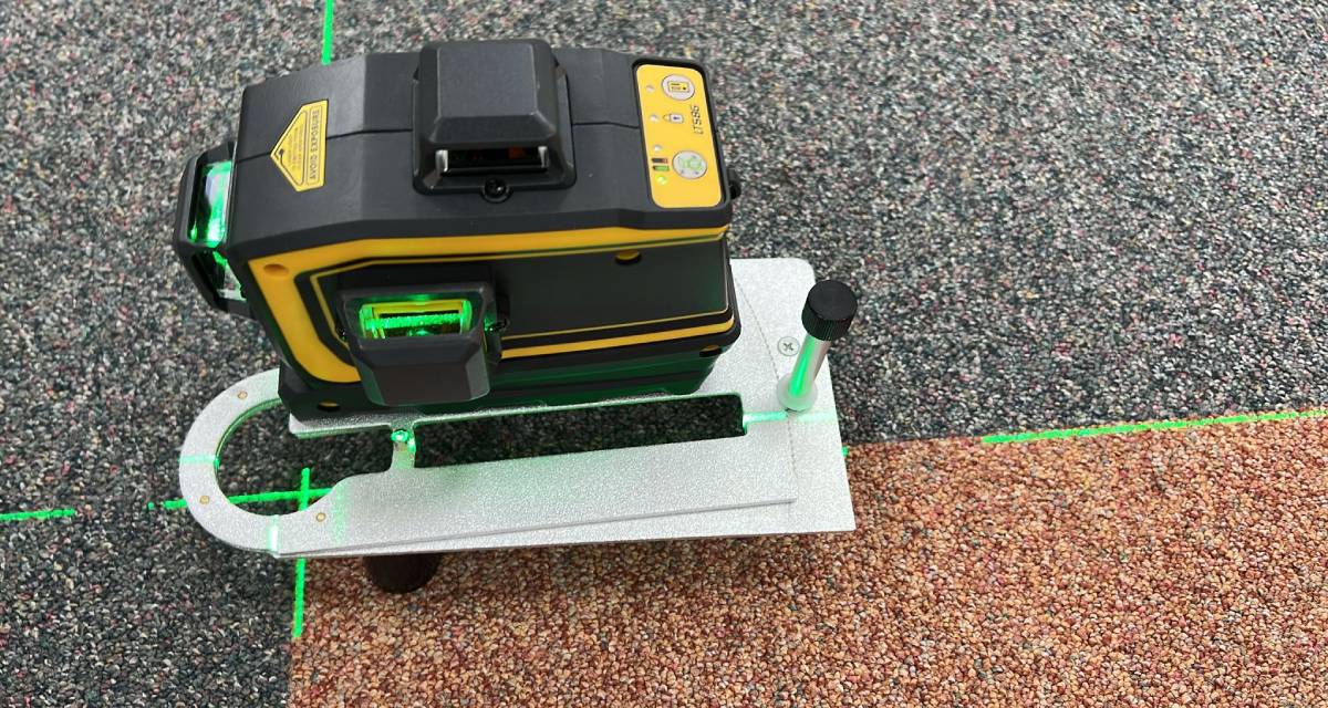 1. Leg de TM156 uitrichtvoet op de plek waar je de laser wilt gebruiken. 2. Zet je Spectra LT56 of LT58G op de voet, geen adapters nodig! 3. Laser aan en zet het kruis op je loodpunt en richt de lasrr grof. 4. Doe de fijnasfstelling met de voet tot je de lijn perfect uitgelijnd hebt en, meten maar!
